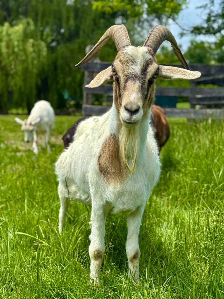 | Rose Willow (AKA Rosie) is as charming as she is unique, a true “misfit” in all the best ways. She’s most famous for her signature “stargazing” habit, where she tilts her head all the way back to look up at the sky and sways gently. She has a way of making everyone feel like her favorite person, sometimes so much so that she wanders off to sunbathe near the humans and forgets where the rest of the herd went. Rosie is looking for sponsors who celebrate her for the very special goat she is! |