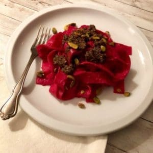 Bright pink, earthy, and punctuated with a sassy pesto, this vibrant dish is perfect to serve to someone you love. A purée of roasted beets lovingly lavished over your favorite pasta makes a statement–for adults and kids. Best to purchase beets that are attached to the stems and greens because you’ll use the greens in your heart-healthy pesto. Use canned or steamed beets if you must but the flavor and color are superior when using fresh.
