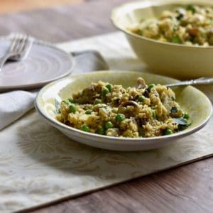 This should be one of your favorite risotto recipes! Light, creamy, and full of fresh spring colors and flavors, it's also vegan. While most risotto can easily be a scrumptious vegan food by using vegetable broth and eliminating the cheese,