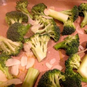 - Preheat oven to 400ºF. Line a baking tray with parchment paper. Cut the broccoli into bite-sized florets. Peel and cut into pieces any stem you may have. Cut the garlic into very, very thin slices. Spread broccoli in a single layer on the lined baking tray, toss sliced garlic around. Drizzle with olive oil and sprinkle with coarse salt and tablespoon or so of nutritional yeast. Roast for about 15 minutes, or until the broccoli has started to brown and is tender when pierced with a fork. Remove from oven, gently stir everything together, and serve immediately.