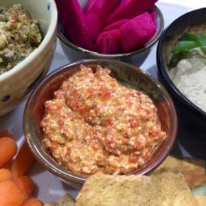 This colorful and tasty dip is the perfect reason to give hummus, the “go-to party dip”, a day off. Roasted Red Pepper and Tofu Feta Dip, a classic Greek recipe that also goes by the name “htipiti” boasts vibrant colors and a sharp-sweet taste. Make our compassionate Tofu Feta Cheese in advance and this party starter will come together in a flash. Use jarred roasted red peppers if you must, but roasting them fresh is simple and produces a delightfully sweet taste. Serve with pita chips, cucumbers and carrots, or warm bread. It also makes a terrific and unusual sandwich spread.