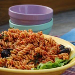 With its bold, audacious flavor and easy preparation, this is a pasta salad designed to be a distinctive departure from tradition. A deep, rich pesto made from sun dried tomatoes stands up to the pasta, even after sitting on the picnic table. Quick roasted chick peas add texture and contrast, and tender black olives provide color and a mild briny accent. This summer, if a marauding band of hungry visitors shows up unannounced, you can rest easy knowing that your well-stocked pantry provides nearly everything you need to make this memorable dish.